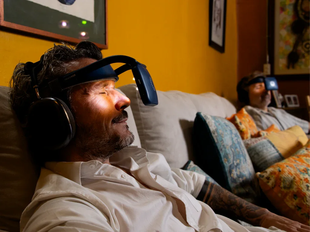 NeuroVIZR gebruikt ritmische licht- en geluidsstimulatie om je hersenen te begeleiden tussen staten van focus, kalmte en rust.